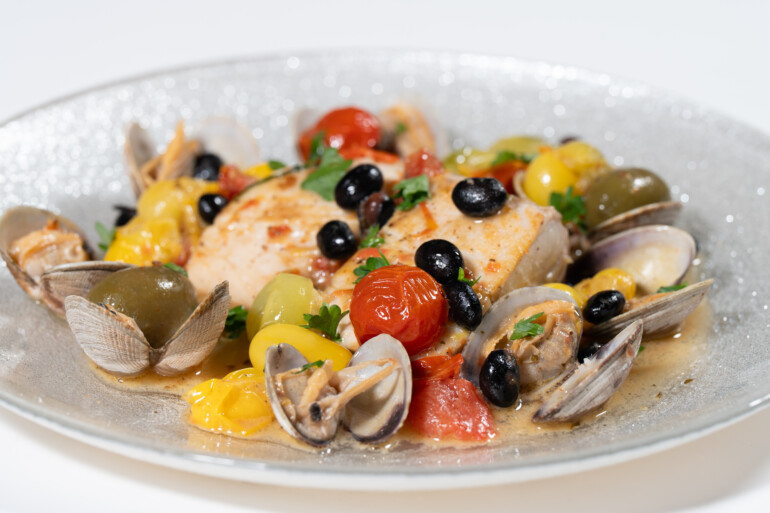 白身魚・あさり・トマトを使うイタリアの漁師料理アクアパッツァに、黒豆を加えて彩りと栄養をプラス。シンプルで華やかな一皿です。