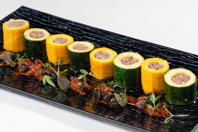 イタリア風の肉詰め「サルシッチャリピエーノ」をズッキーニで。黒豆は南イタリアのトマトベース“ピッツァイオーラソース”で引き立てます。