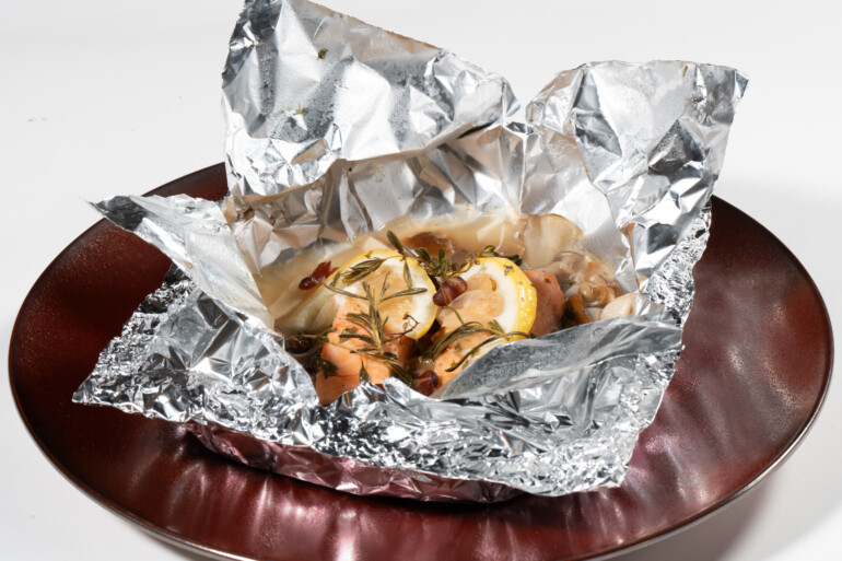 | 3 | もう1枚のホイルをふんわりかぶせ、周囲を1cm幅で3回折ってしっかり閉じる。オーブン200℃で20分焼いて完成。 |